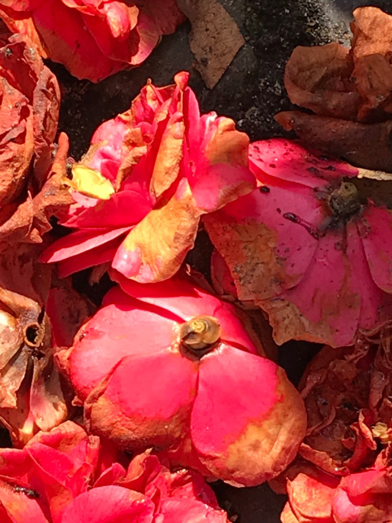 But I’m wondering if I don’t prefer them dying. In gutters, on pavements and drains they now present as truly beautiful potpourris. Some flowers have gone. Others still have a delicate pulse like Dumas’ famous creation La Dame aux Camélias.