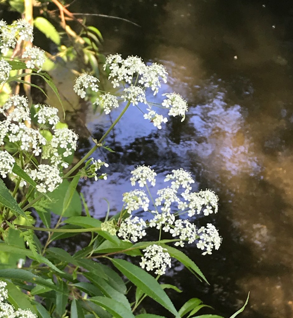 The River Wey meanders narrowly through much of rural Surrey, here bordered by cow parsley and reflecting the blue sky of late afternoon. Something resembling summer today.