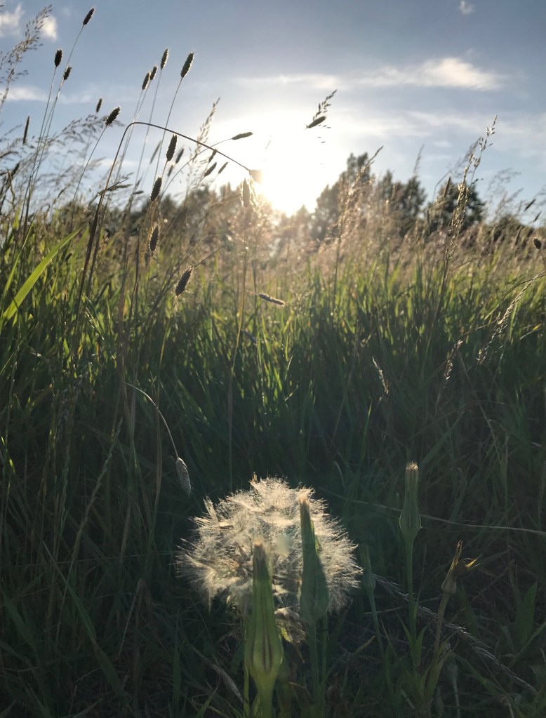 Couldn’t resist this dandelion parachute ball caught in the sun’s rays this evening. It was like a floodlit arena at dusk in the shadowy grasses. They’re so much more beautiful than the flowers that precede them.