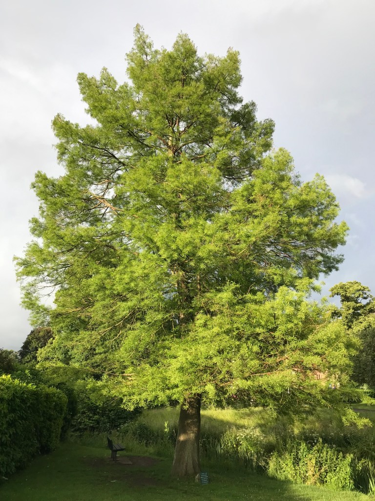 A plaque at the bottom declares it was a gift from American visitors from New Jersey in honour of the Queen’s Jubilee in 1977. And sure enough, it’s a bald cypress – apparently iconic for residents of the south-eastern US. My research says the genus taxodium was widespread in both America and Europe pre-Ice Age (presumably someone knows that…), but later became extinct in Europe. So how nice that we have a rare example right here.