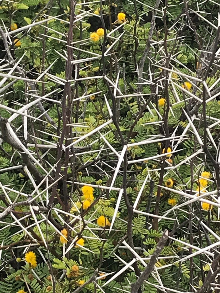 This isn’t a bush you want to land in when your parachute goes off course. It may have little yellow pompom flowers, but the base of each leaf has a pair of thorns…