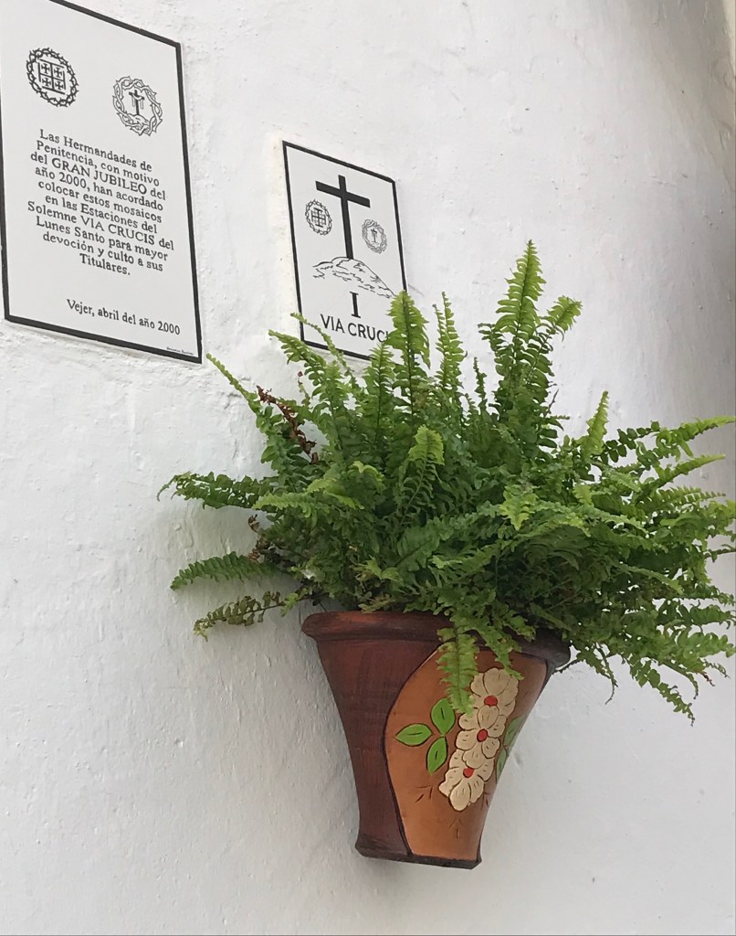 On a whitewashed wall in the church square hangs a hand-painted pot with a sword fern. Above it are two plaques. One explains that to celebrate the year 2000 AD, the local ‘fraternity of penitents’ decided to put up markers for the Stations of the Cross, which the penitents follow on the Monday of every Easter Week. The other indicates the first Station. So the Latin name nephrolepsis exaltata sounds oddly apt.