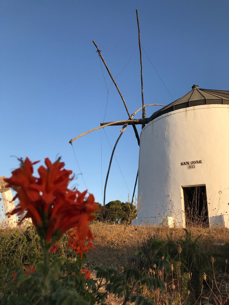 It’s becoming more challenging to find wild plants that are still alive in the intense heat of an Andalusian late July. Here a cape honeysuckle stands alone amid the crispy grasses that surround this old windmill.
