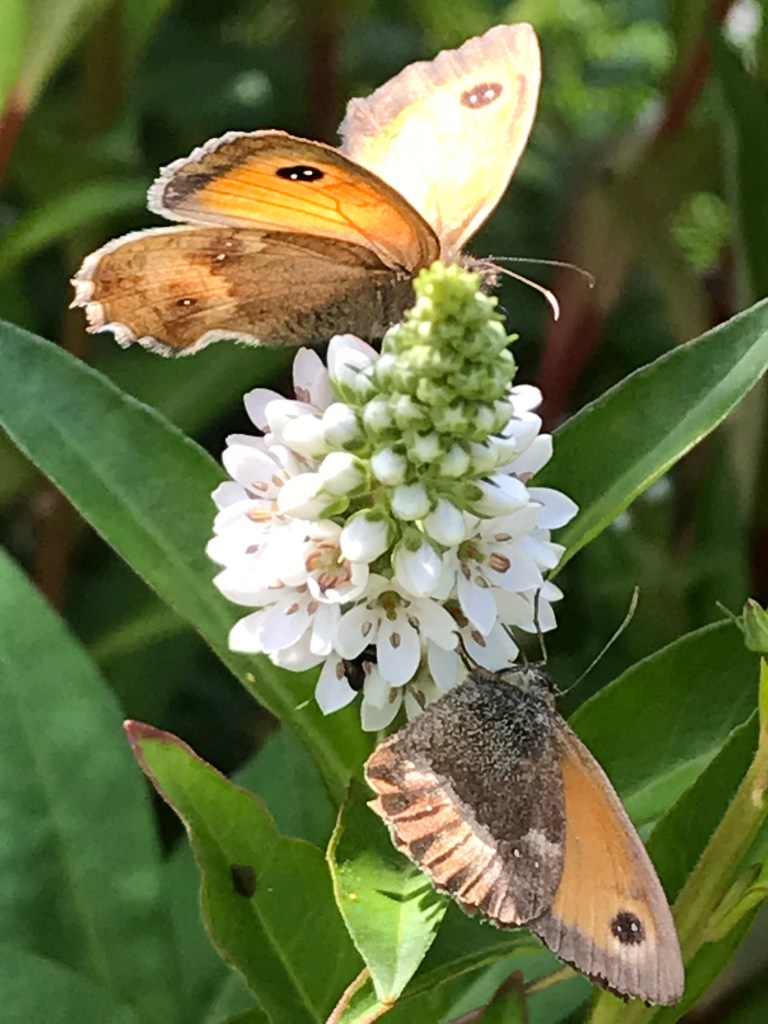 I saw these gatekeeper (or hedge brown) butterflies today in a Hampshire garden. They’re sharing the delights of a speedwell flower (veronica longifolia, I think).