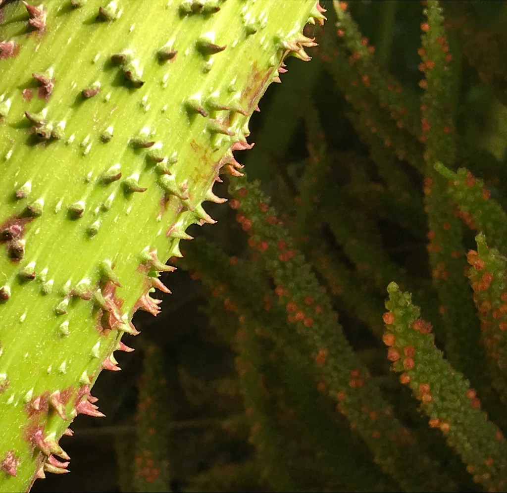 At first, the leaves drew my attention – they are huge and not unattractive. But the other details: the spikes, red and green pustules and large red tangled mass between the spikes were like something you might visualise in a nightmare if you had a very bad sore throat.