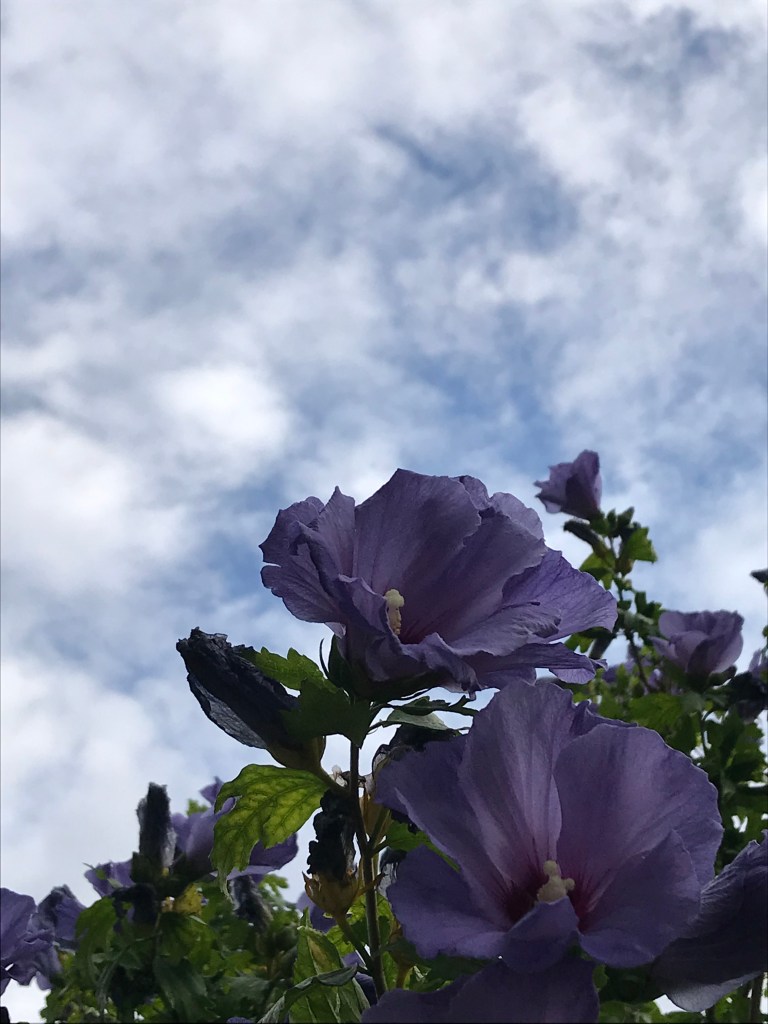 On the way to the supermarket this evening I stopped to admire these blue flowers spilling over a garden wall, against the marble sky. Lavatera I think (?), made all the lovelier because they attract butterflies.