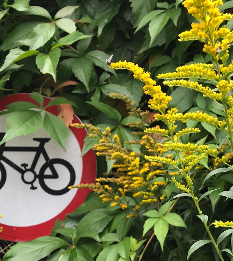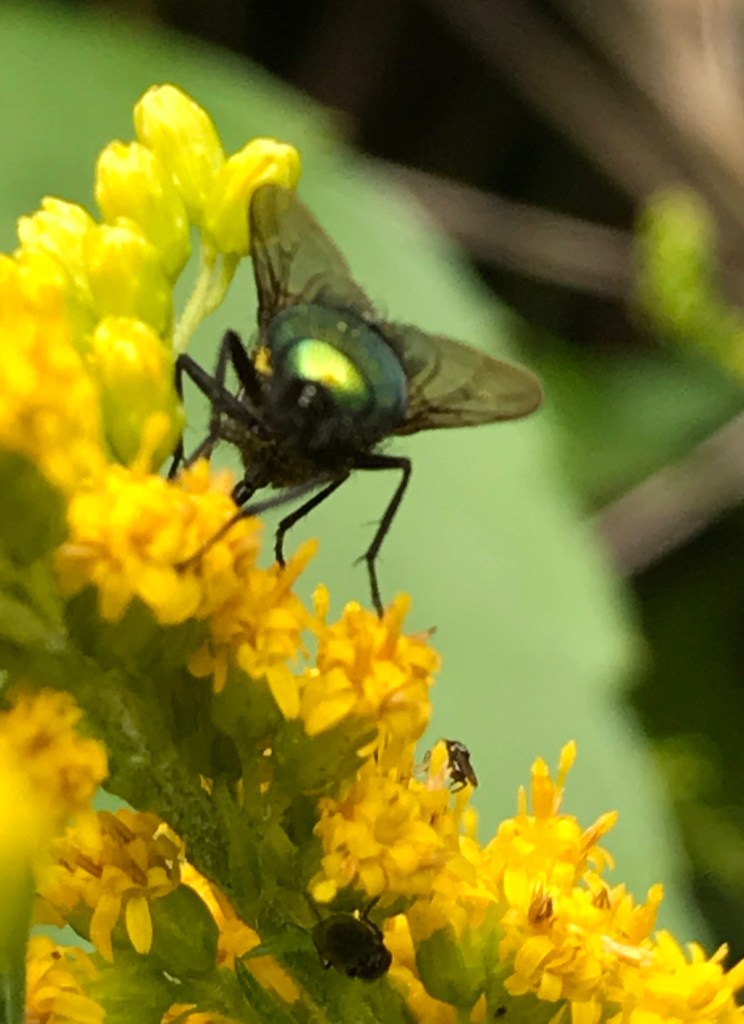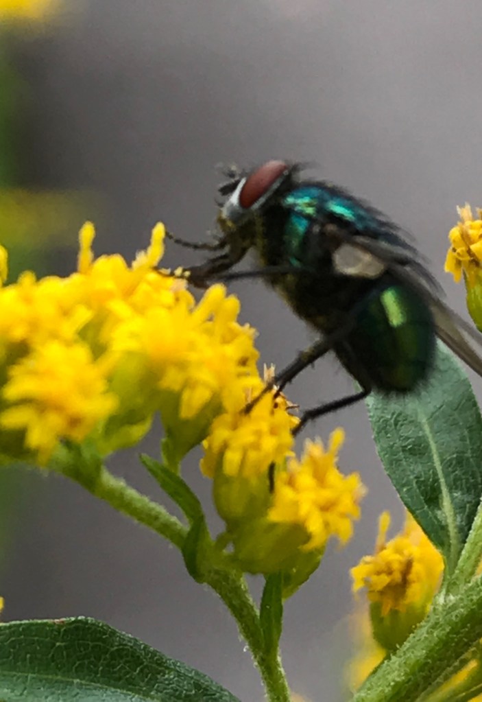 Been feeling quite itchy ever since I took these pictures. This Canadian goldenrod, growing wild beside a path today, seems to be so popular with flies. I haven’t managed to identify them, but I’m struck by their red eyes and multi-coloured metallic bodies.
