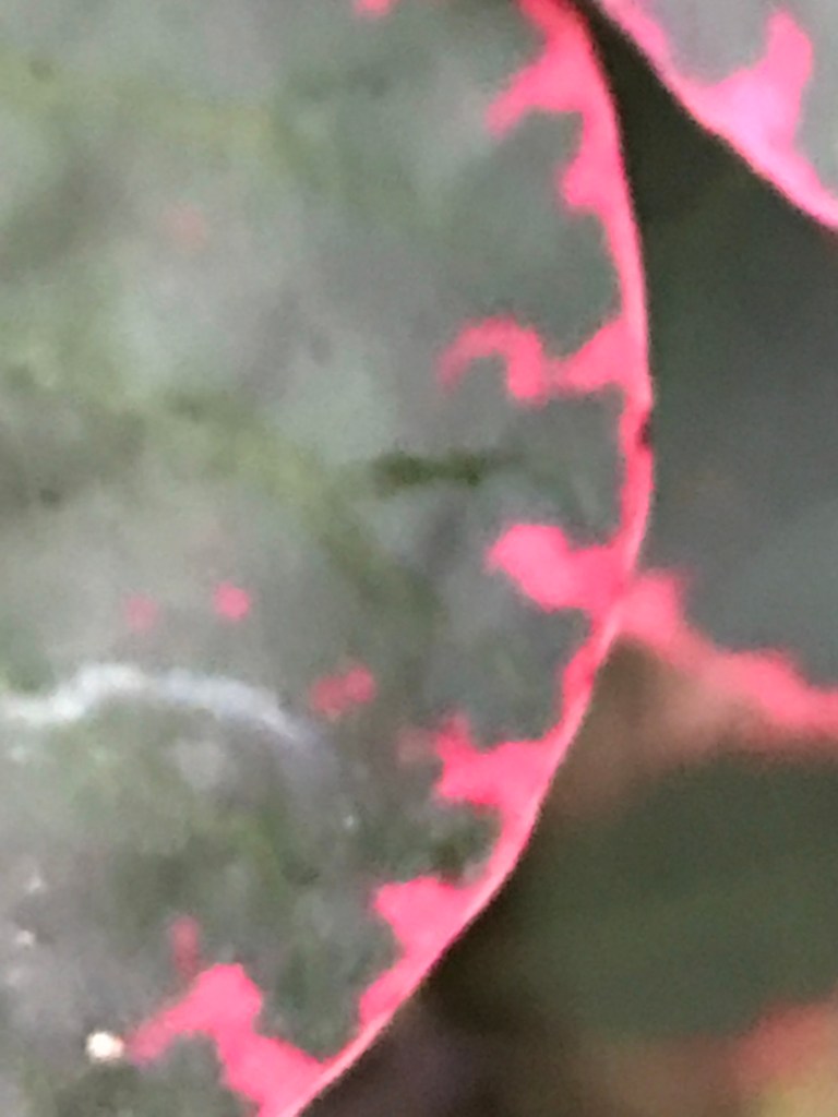 Back to dull Surrey skies today. A quick investigation of the garden as light was fading uncovered these bizarre leaves. Close up, the edges look like pink blanket stitch. Perhaps the start of a colour change for autumn.