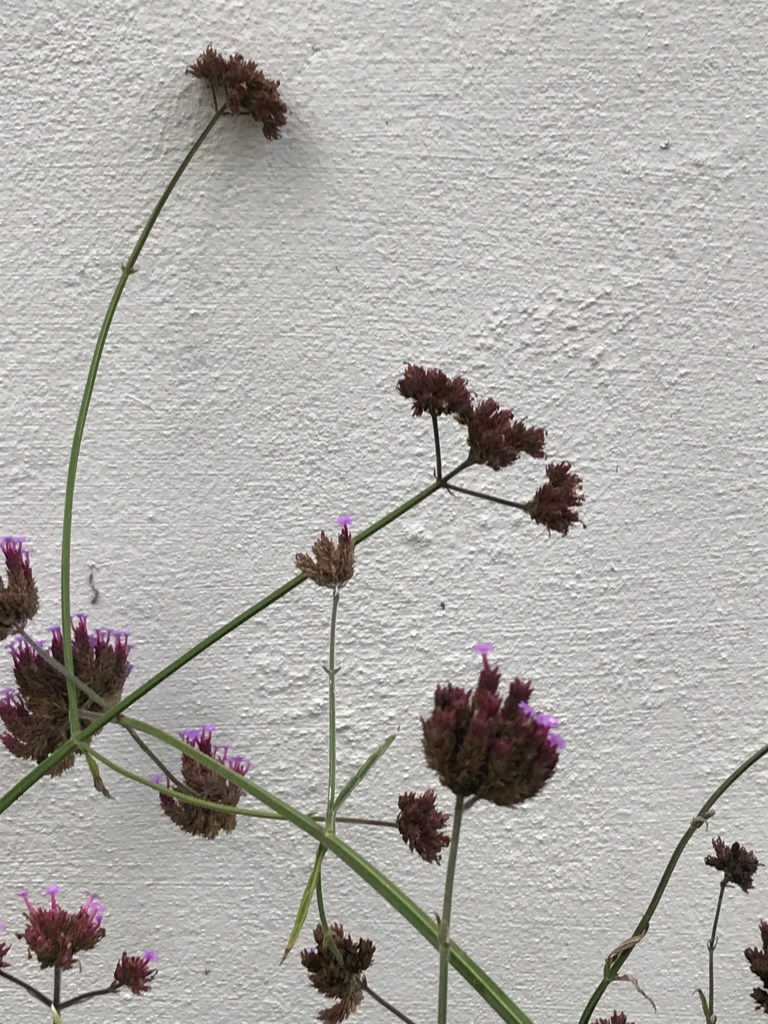 Strange what close-up images can do. This lovely long-limbed vervain drapes itself elegantly against my friend’s whitewashed cottage wall. I like the blend of live and dried flower heads. But when viewed through the powerful lens of my iPhone, it is suddenly stubby.