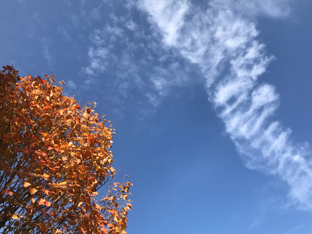 I couldn’t take my eyes off this young tree in our local meadow. It seemed further into autumn than most others. I was sure it was a sycamore, but the identification site I use insists it’s a red maple. Even the clouds lined up in parallel. And the bark made its own pink and grey painting.