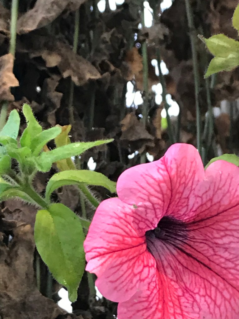 Yes, yes, I know the flower on the right is a petunia. But what are the strange, pink-tinged leaves in the left-hand picture? Both are attached to these long, dead strings from a hanging basket on the high street. Today was a miserable, continuous downpour. So this was a dash-out-dash-in photo. All I can say is that ‘Clamium’ absolutely sums up the experience.