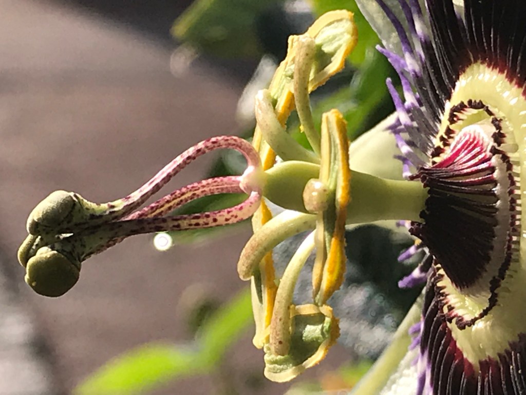 The Japanese call it clock plant because apparently there are 12 petals and they think the other parts look a bit like a winding mechanism. My mother said ‘steering wheel’ and I think I’m more with her. Elsewhere it is known as flower of the five wounds, which I think may be a religious reference, as is passion flower – referring to Christ.