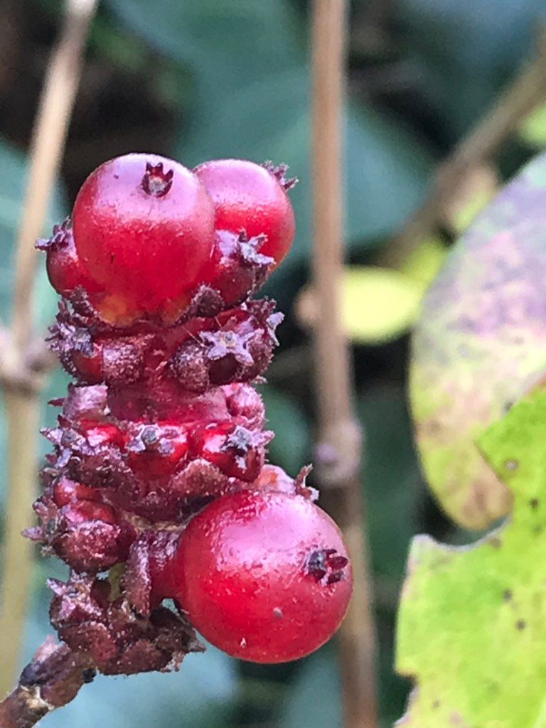 Strange how we tend to associate a plant (or perhaps it’s just me in my ignorance) with either flowers or berries but not both. So I’d never noticed these glacé cherry look-a-likes on a honeysuckle before.
