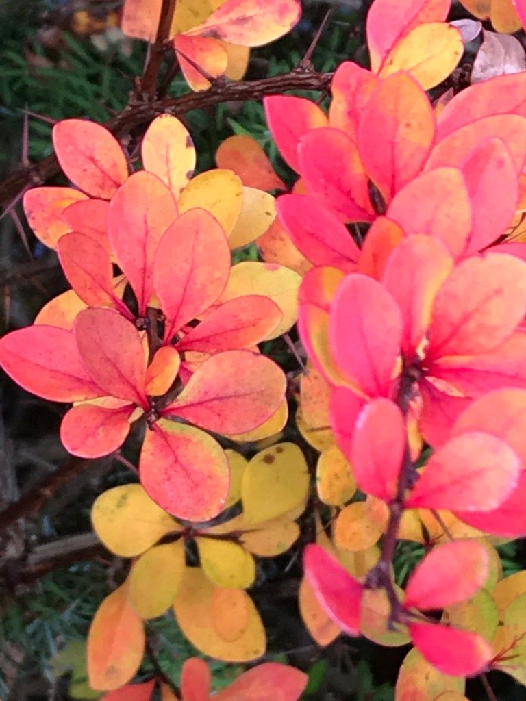 When I was a child I thought hedges were privets, because that’s what ours was and pretty much all the hedges in the road were that kind. It’s been one of the many pleasures of this blog to discover so many that aren’t. Like this barberry looking a lot better in autumn than in summer. I read they are meant to have fruits, but not sure when…