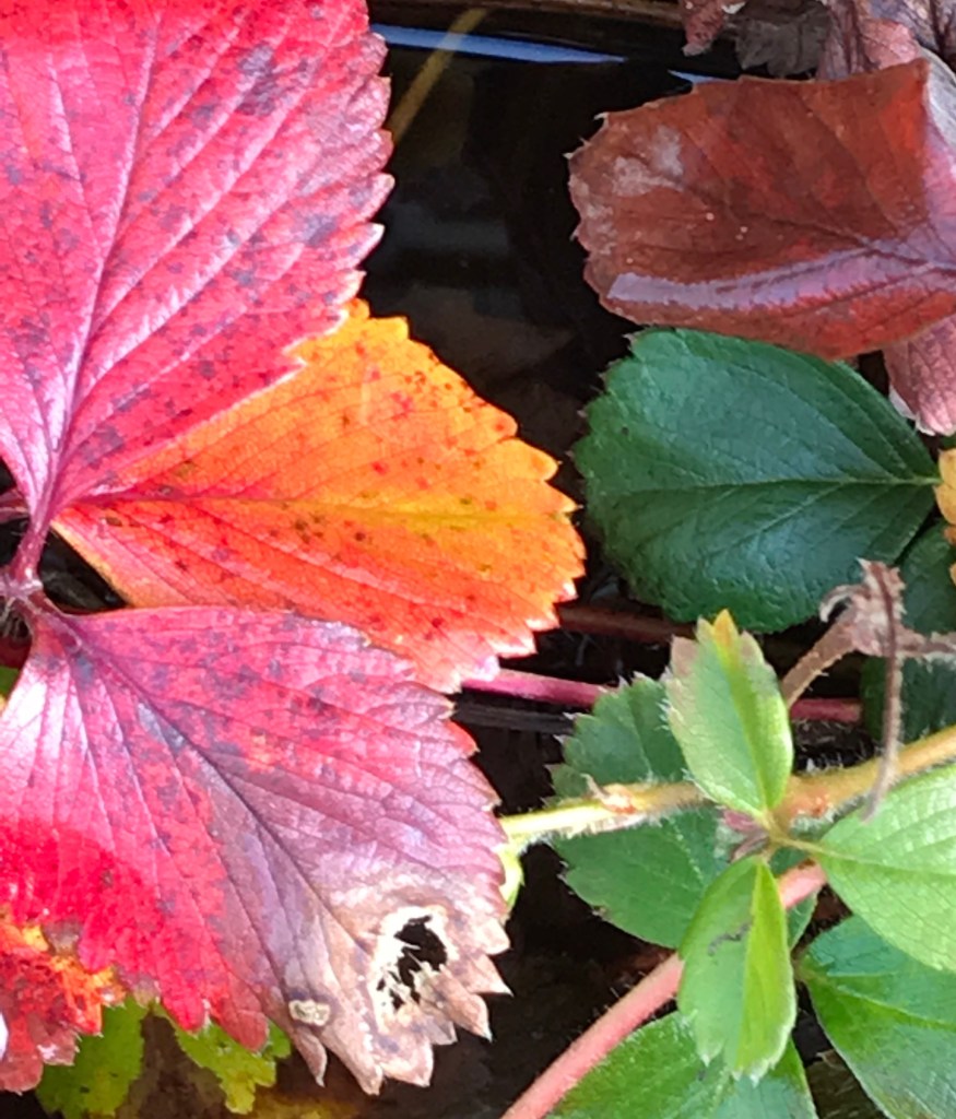 I liked these multi-coloured leaves in a terracotta pot in front of the terracota building at the Farnham Pottery today. They matched beautifully. But I had real doubts about this being a strawberry plant (as my usual site suggested). Until… I saw the very strawberry-like form at the bottom of the right-hand picture. Well, well.