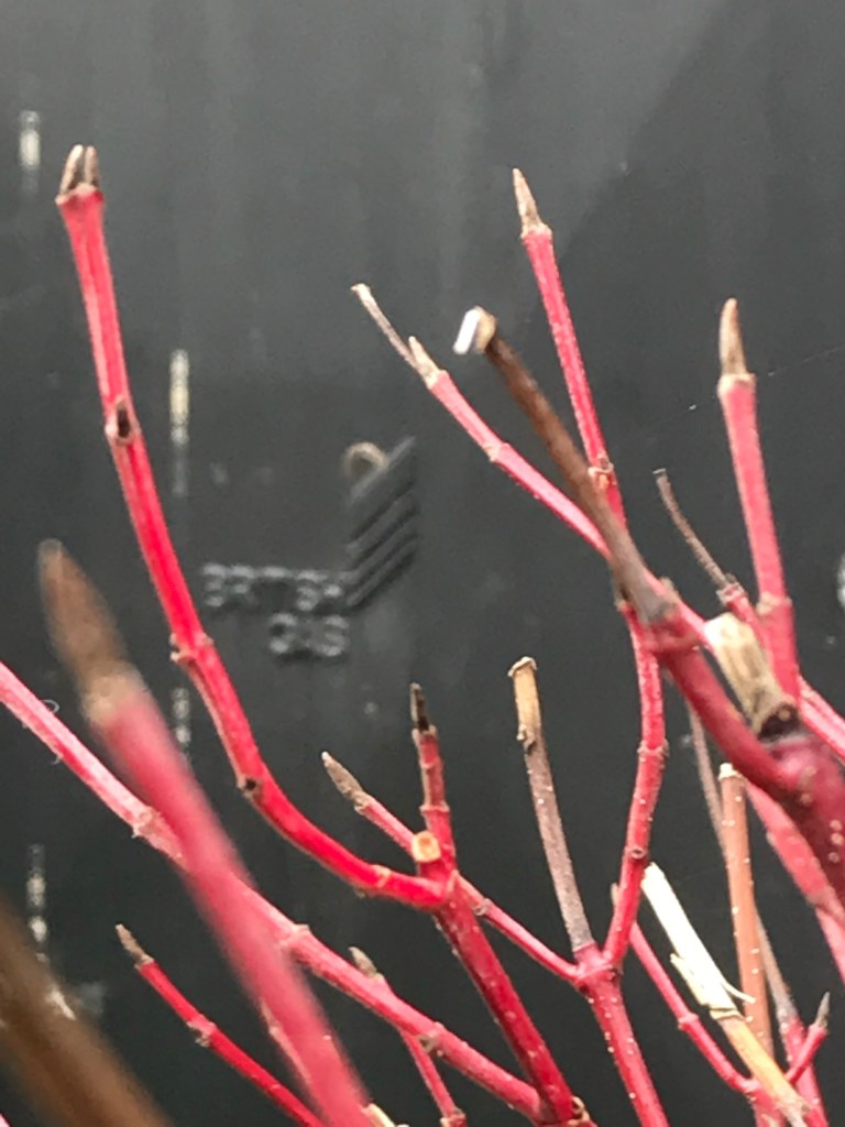 Couldn’t resist these two pruned dogwood bushes side by side today, set against the dark grey of a British Gas panel. Maybe it’s because they are the colours of the Spanish flag.