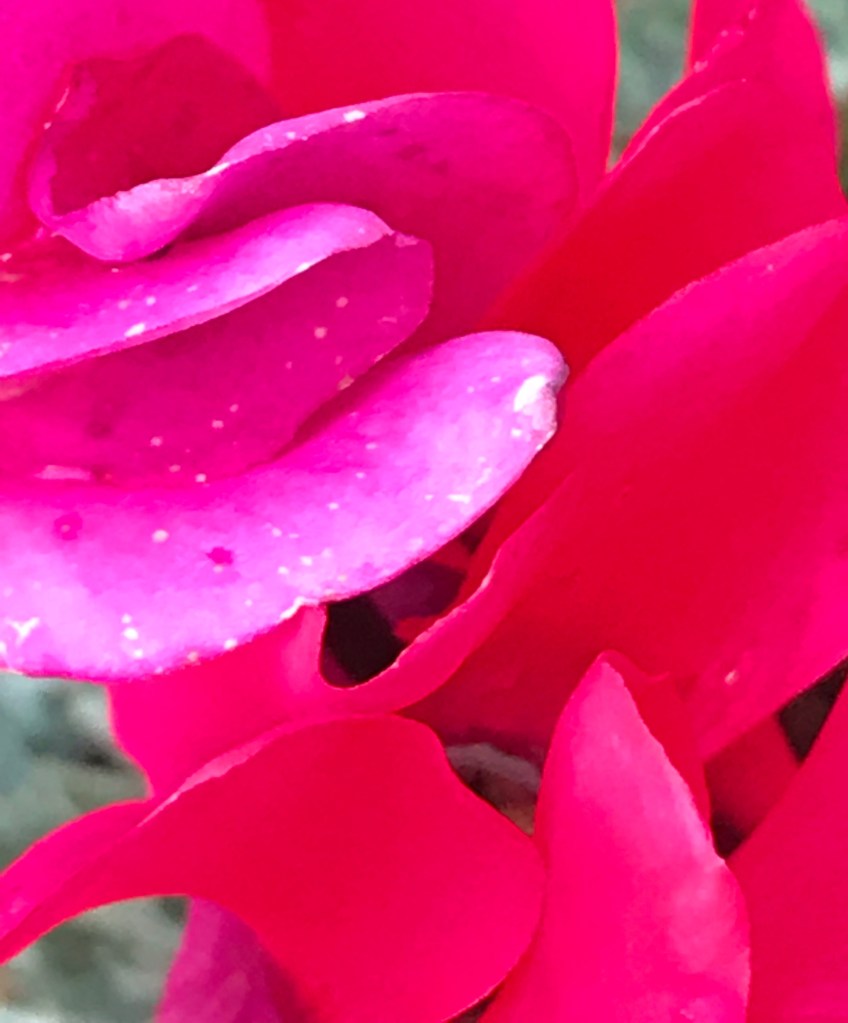 On gloomy days, of which there have been so many this week, it’s good to get up close and personal with a bright-petalled plant. It’s like colour therapy. This cyclamen adorns our outside window sill by the dining room.