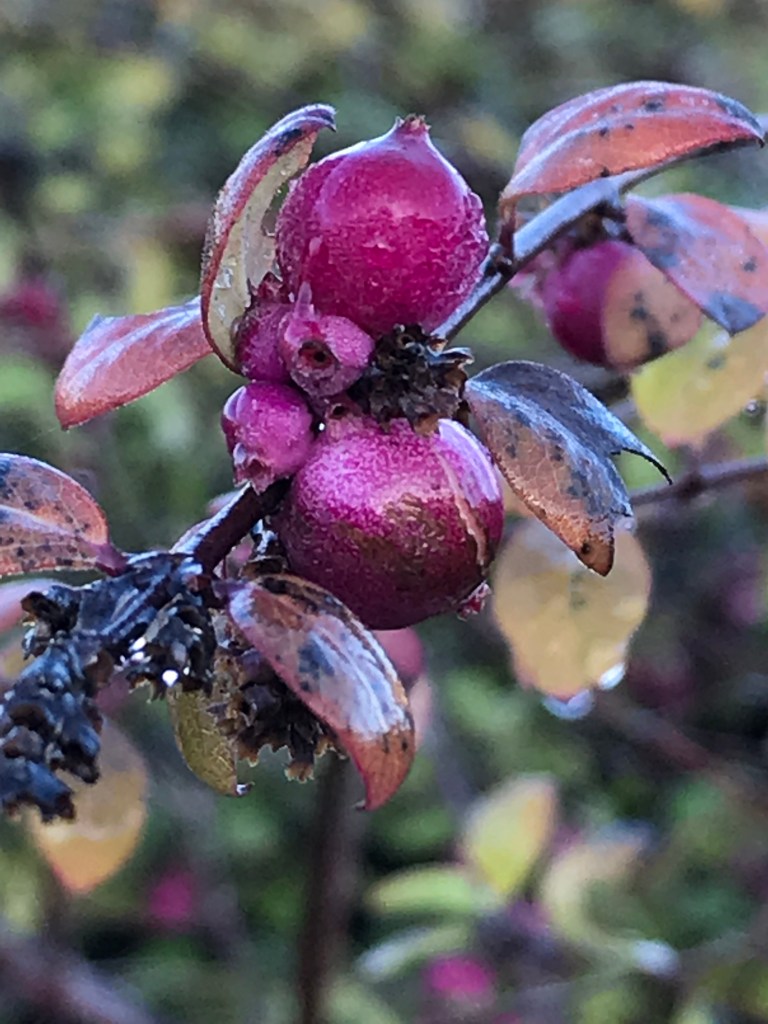 Just when you’re getting bored with red berries, up pop some original purple-pink ones. These looked as though they’d been glacéd too. I was a bit worried that if anyone saw me snapping them outside the eye hospital, they might think I didn’t really need my appointment. But I think I got away with it…